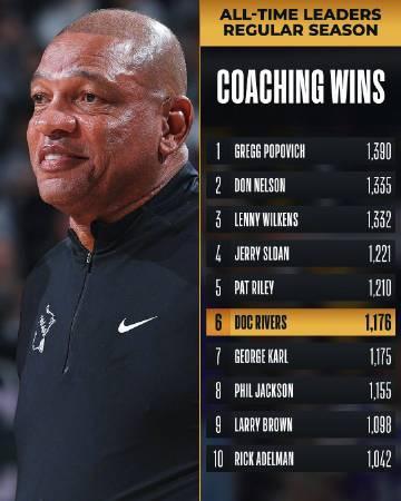 憑借這場勝利,里弗斯取得了NBA執(zhí)教生涯的第1176場勝利,正式超越傳奇教練喬治-卡爾,升至聯(lián)盟歷史常規(guī)賽勝場榜第六位。