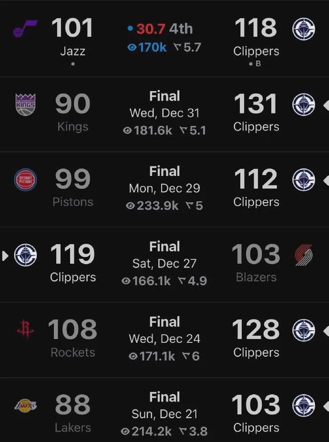值得一提的是,在祖巴茨受傷的那場比賽以及休戰(zhàn)的五場比賽里,快船全部贏球從而豪取六連勝,因此戰(zhàn)績從墊底位置飆升至如今的12勝21負位列西部第11,暫時落后第十的開拓者兩個勝場。