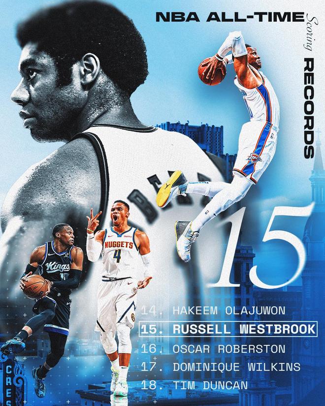 威少拿下17分后,生涯總得分來到26711分,成功超越大O升至NBA歷史得分排行榜第15位,也成為NBA歷史控衛(wèi)得分王。