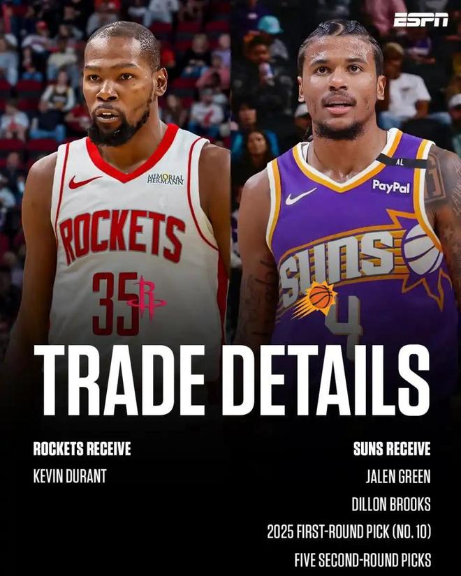 接著用一筆極度廉價的交易將杜蘭特1換8送往火箭隊,僅換回杰倫格林、狄龍、25年10號簽,外加5個次輪簽(25年火箭59號簽、26年火箭的兩個次輪簽、30年凱爾特人的次輪簽和32年火箭次輪簽)。