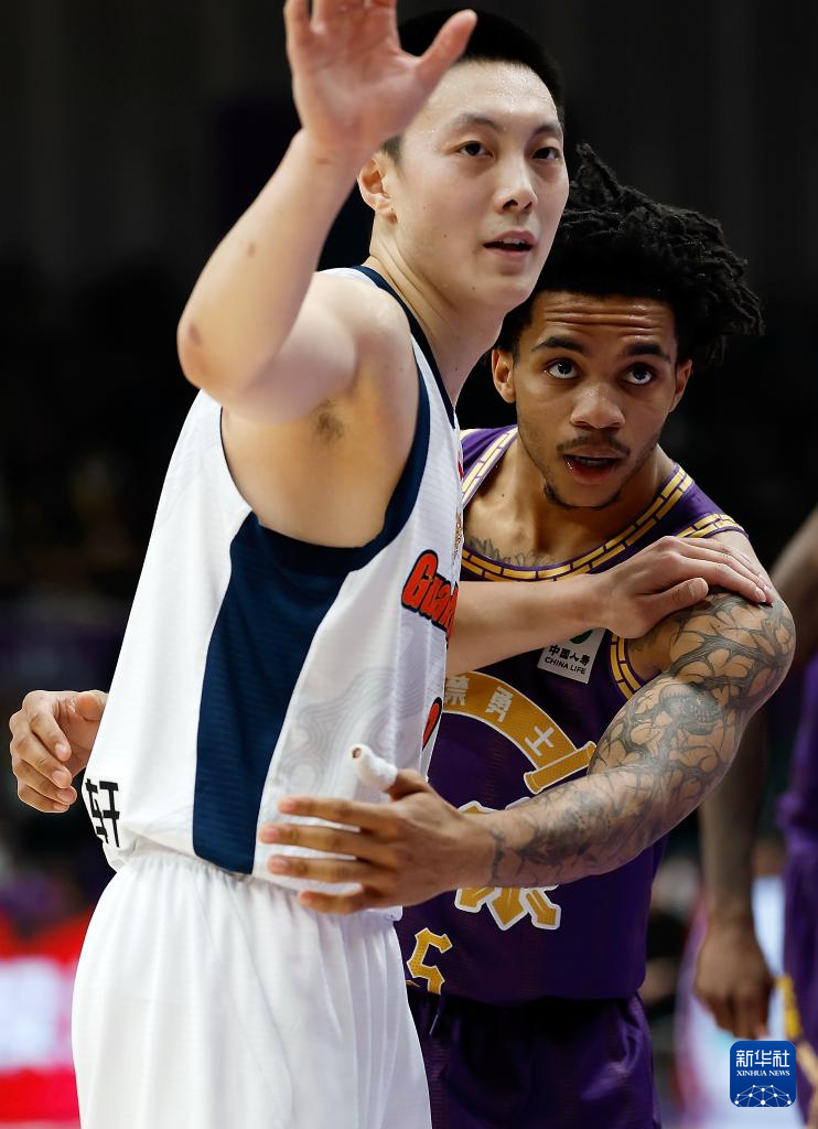 1月3日,北京控股隊(duì)球員廖三寧(右)與隊(duì)友雷吉納德·佩里在比賽中擊掌。