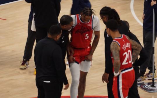 在比賽期間,剛剛傷愈復(fù)出不久的快船前鋒小德里克-瓊斯在一次球權(quán)拼搶中與綠軍后衛(wèi)佩頓-普里查德糾纏在了一起,隨后他被后者從側(cè)面壓到了右腿外側(cè)導(dǎo)致受傷。值得一提的是,小瓊斯之前受傷就是因?yàn)樵诒举惣?1月首次與綠軍交手時(shí)受傷的,當(dāng)時(shí)他被杰倫-布朗壓到腿部導(dǎo)致受傷。