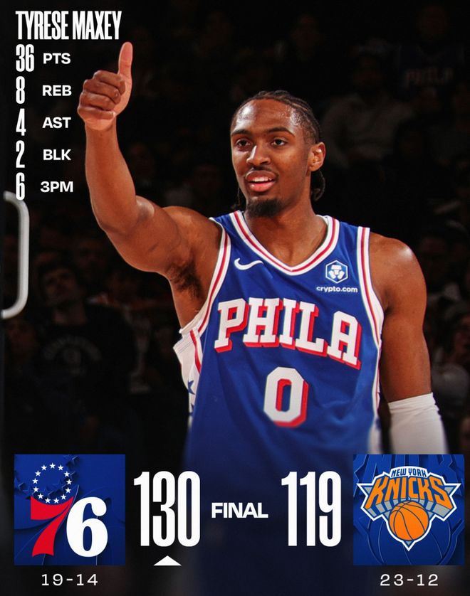 此役馬克西全場比賽37分鐘,22中14,三分9中6,罰球4中2,拿到36分8籃板4助攻1搶斷2蓋帽,命中率63.6%,三分命中率66.7%,他的35+場次在本賽季東部排名第一。