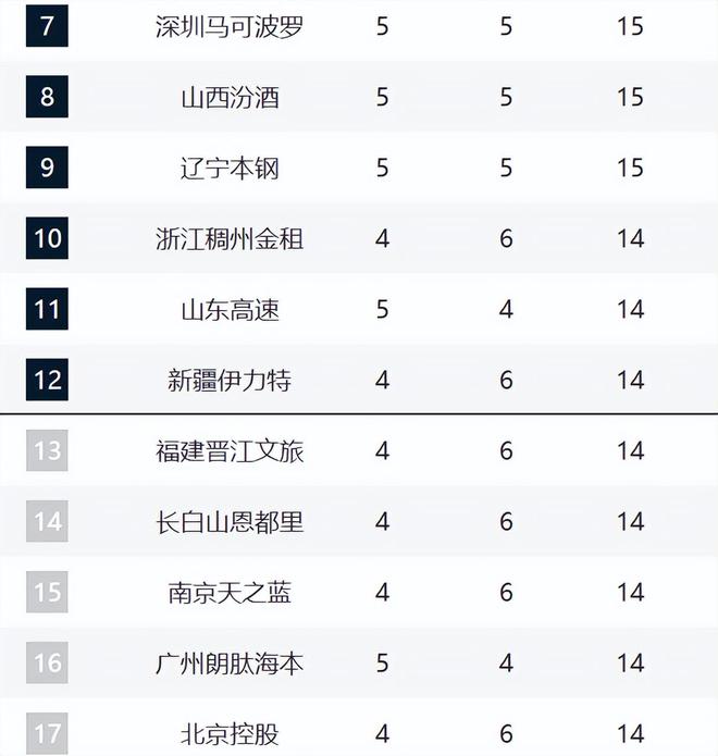 深圳、山西和遼寧排在7-9都是5勝。深圳這輪擊敗浙江,讓對手止住連勝。山西這輪擊敗江蘇,勉強止住頹勢。遼寧擊敗吉林,也是止住連敗。不過他們后續(xù)的壓力都非常大,看看能不能調(diào)整過來吧。