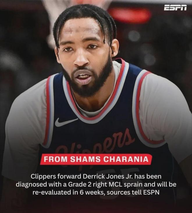 爆料王Shams:小瓊斯被診斷為右膝內(nèi)側(cè)副韌帶二級扭傷,六周后重新評估。