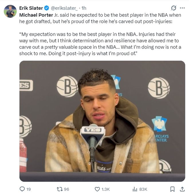 小波特目前場(chǎng)均33分鐘,拿到25.9分7.6籃板3.4助攻0.9搶斷0.2蓋帽,命中率49.5%,三分命中率40.98%,就連追夢(mèng)都說小波特如今在籃網(wǎng)打出了當(dāng)年他進(jìn)入聯(lián)盟球迷所期望的樣子,目前勇士、雄鹿、活塞等多支球隊(duì)都有意交易得到他。