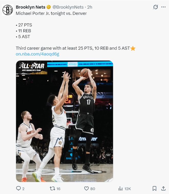 籃網(wǎng)官方也寫道,小波特加盟球隊(duì)后已經(jīng)拿到了三場(chǎng)25+10+5的數(shù)據(jù),這是在掘金生涯非常罕見的存在,而且小波特加盟籃網(wǎng)27場(chǎng)已經(jīng)已經(jīng)拿到698分是隊(duì)史第六高的。