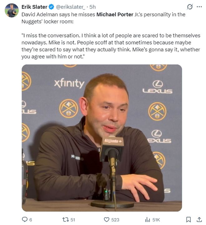 阿德爾曼也談到小波特之前在掘金更衣室的一些事件,他表示自己還很懷念,不過休賽期那筆交易其實(shí)對(duì)籃網(wǎng)、掘金都有好處。