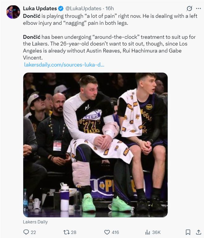 賽前東契奇媒體透露東皇一直都在傷病中,他表示:東契奇目前帶著諸多傷病堅(jiān)持登場(chǎng),目前東契奇的左肘有傷,雙腿也一直隱隱作痛,他每一場(chǎng)比賽后都會(huì)進(jìn)行一些治療以便能為湖人出戰(zhàn)。這位26歲的球星不想缺席比賽,因?yàn)樗篮艘呀?jīng)缺少了文森特、八村壘、里夫斯等多位球員。
