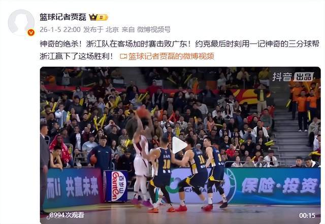 籃球記者賈磊老師則表示:“神奇的絕殺!浙江隊在客場加時賽擊敗廣東!約克最后時刻用一記神奇的三分球幫浙江贏下了這場勝利!”