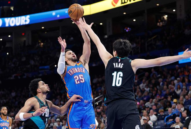 看幾組數(shù)據(jù),首先,雷霆本賽季場均35.1個防守籃板聯(lián)盟第2,但場均只有9.1個進攻籃板,聯(lián)盟第29!簡單來說,他們必須保障效率,因為很難有像樣的二次進攻,本身身高的劣勢,就不具備沖搶的條件。其次,雷霆本賽季一共得到849次罰球,場均23.6次罰球只排名聯(lián)盟第20位;而雷霆的對手,本賽季合計得到855次罰球,場均23.8次罰球。別看這差距不算大,實際上雷霆本賽季場均23.6次罰球,相較于上賽季,已經(jīng)提升了15.7%,在陣容和打法沒太大變化的情況下,只有一種解釋:有吹罰紅利。