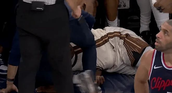 快船后場核心哈登因為右肩酸疼缺席,他來到現(xiàn)場躺著觀看比賽。