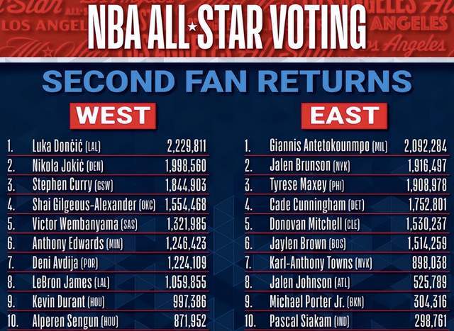 全明星第二輪投票結(jié)果出爐,東西部前五球員沒有變化,票王還是東契奇,獲得了222多萬票,字母哥則是東部第一,距離東契奇也就十多萬的差距,也是有機(jī)會(huì)的。西部前五分別是東契奇、約基奇、庫里、亞歷山大和文班亞馬,東部前五則是字母哥、布倫森、馬克西、康寧漢姆和米切爾。按照規(guī)定,全明星首發(fā)球迷投票占比50%,NBA球員和媒體小組占據(jù)的比例均為25%。