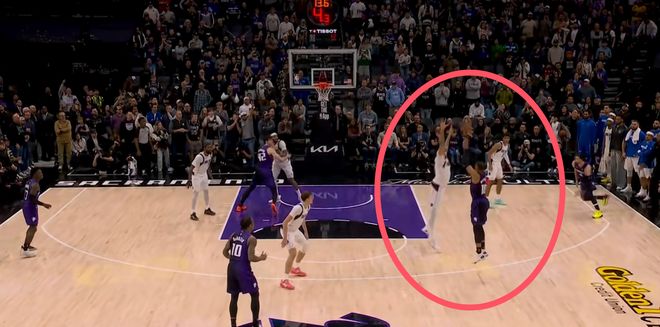 而在最后的一個進攻回合里,國王98:100落后2分,時間還是有很完整的進攻回合的,這個球最終威少拿球時還有6秒,他運了一會,沒有選擇壓時間,而是直接出手了后撤步干拔三分,面對的還是濃眉哥。