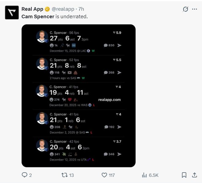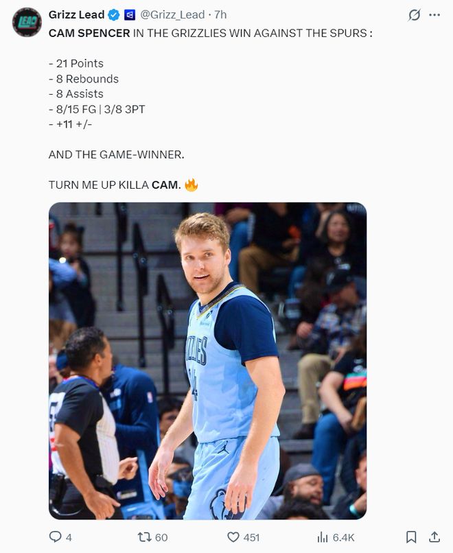 斯潘塞是2024年次輪53順位被灰熊選中的淘金選手,他24-25賽季是拿雙向合同,2025年夏灰熊才跟他簽下一份四年1039萬的合同,本賽季年薪只有253萬,沒想到莫蘭特本賽季又是各種傷停,這讓他有了嶄露頭角的機會。