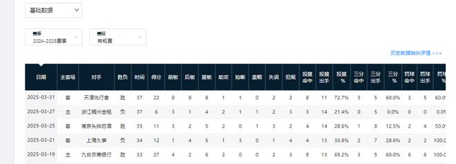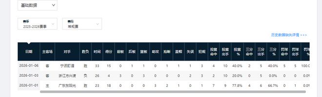 前六場比賽,他的三分命中率依次是33.3%,0%,50%,16.7%,42.9%,25%。
