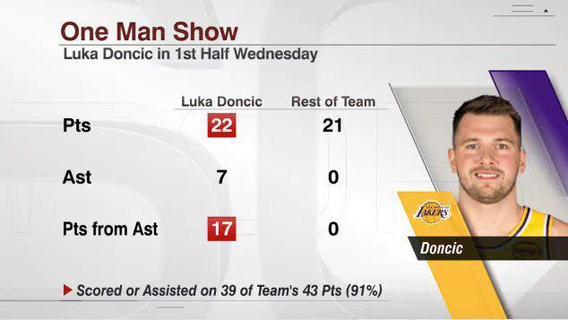 值得一提的是,湖人上半場得到的43分,其中有39分來自東契奇直接得分,或者東契奇助攻得分,折射出東契奇之于湖人的重要性。