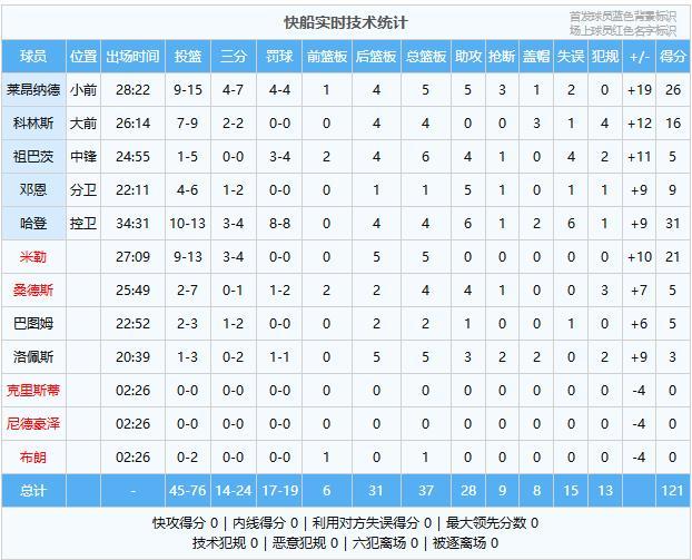 快船:哈登31分4板6助2帽、萊昂納德26分5板5助3斷、米勒21分5板、科林斯16分4板3帽、鄧恩9分1板5助、祖巴茨5分6板4助、桑德斯5分4板4助、巴圖姆5分2板1助、洛佩斯3分5板3助2斷2帽、布朗1板