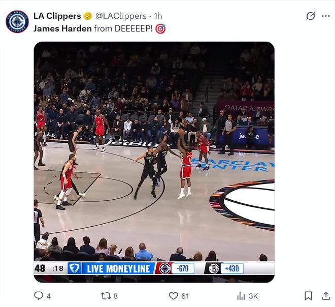 全場比賽哈登34分鐘,13中10,三分4中3,罰球8中8,拿到31分6助攻4籃板1搶斷2蓋帽,命中率76.9%,三分命中率75%,真實命中率93.8%,正負(fù)值+9。
