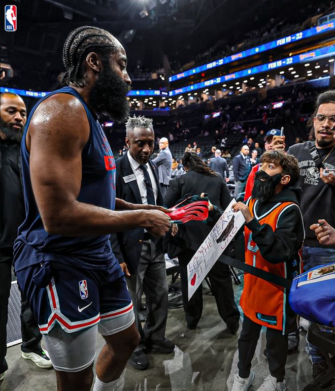 哈登曾為這座城市鏖戰(zhàn)兩個賽季,他拖著腿筋拉傷的腳努力扛著這支球隊前行,所以當(dāng)籃網(wǎng)交易哈登時沒有籃網(wǎng)球迷責(zé)怪他,每當(dāng)他回到這里都會有球迷為他加油。此役之前一位小球迷拿著支持哈登的展板還帶著大胡子來應(yīng)援,哈登暖心的送上了簽名球鞋。