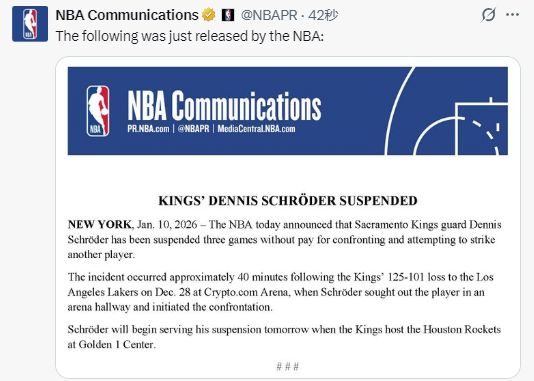 北京時(shí)間1月11日,NBA官方今日宣布,薩克拉門托國王隊(duì)后衛(wèi)丹尼斯-施羅德因與另一名球員發(fā)生對峙并試圖動手擊打?qū)Ψ?,被處以禁賽三場且無薪的處罰。