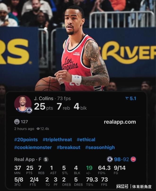 科林斯剛加盟快船隊時,只能擔(dān)任替補角色。不過,在打了九場比賽之后,他便被正式提上首發(fā)。進(jìn)入2026年后的里,他的表現(xiàn)始終十分出色,投籃總共57次命中41次(命中率大約為72%),其中三分球24投16中(命中率大約為67%),已然成為快船隊當(dāng)前除倫納德之外,最為可靠的火力輸出點。