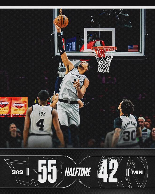馬刺榜眼哈珀最近狀態(tài)不佳,過去4場比賽場均4.3分2.3助攻,投籃命中率只有21.9%(32投7中)。說回比賽,馬刺開局轟出16-0的攻擊波。森林狼主場球迷有個傳統(tǒng),主隊進球后才會坐下。開場打了4分40秒,森林狼終于得分了。