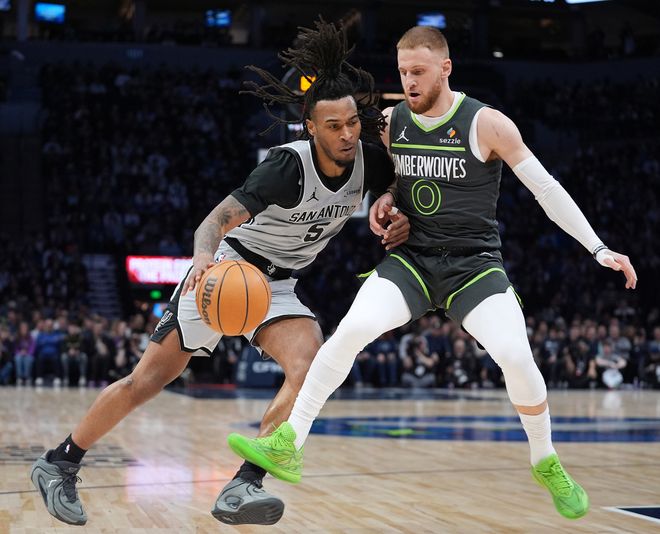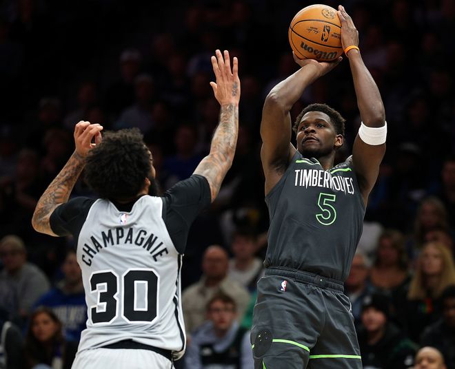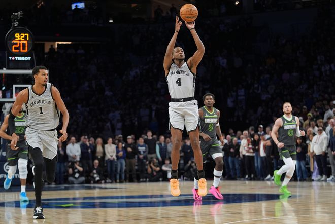 進入最后5分鐘馬刺都還領(lǐng)先森林狼6分,里德、愛德華茲、蘭德爾一人命中一球后森林狼完成扳平,終場前2分19秒愛德華茲突破命中后森林狼實現(xiàn)了反超,終場前1分28秒巴恩斯三分命中馬刺再度反超,麥丹終場前48秒中投森林狼又反超,??怂菇K場前33秒命中關(guān)鍵中投馬刺103-102領(lǐng)先1分。