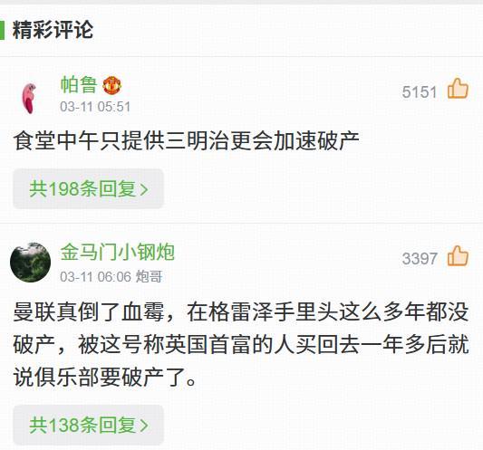 關(guān)于曼聯(lián)可能會在圣誕節(jié)前破產(chǎn)的言論,多數(shù)球迷并不買賬,認(rèn)為“資本家哭窮是有一套的”、“早早把曼聯(lián)賣給石油老板就完了”。