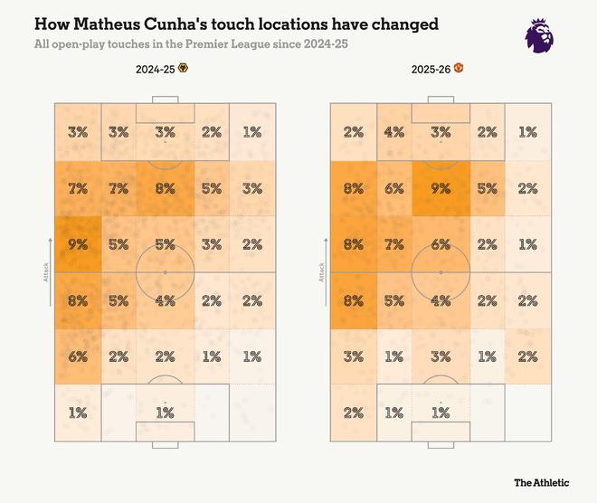 值得肯定的是,阿莫林和庫尼亞在多場(chǎng)比賽中找到了新的方式,即便沒有類似狼隊(duì)時(shí)期拉森那樣的中鋒。在安菲爾德2-1的勝利證明了球隊(duì)在無中鋒體系下的可行性,庫尼亞更多通過爭(zhēng)搶長(zhǎng)傳后的第二落點(diǎn),并在轉(zhuǎn)換階段參與進(jìn)攻。曼聯(lián)在比賽中偶爾會(huì)在對(duì)方禁區(qū)前出現(xiàn)一小段進(jìn)攻空當(dāng),但庫尼亞正在嘗試?yán)@開這一空間,而不是被限制其中。需要注意的是,本賽季多古和達(dá)洛特從庫尼亞腳下接球時(shí)所處的位置靠前。曼聯(lián)2025-26賽季的走勢(shì),在很大程度上將取決于翼衛(wèi)在進(jìn)攻三區(qū)的表現(xiàn)。