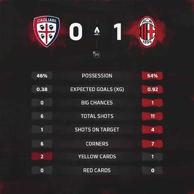下半場補時4分鐘。最終全場比賽結(jié)束,卡利亞里0-1米蘭。