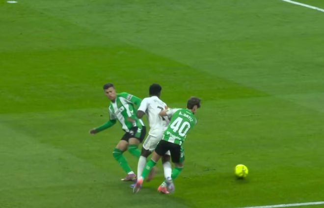 比賽的第5分鐘,維尼修斯突入禁區(qū)左肋,在兩名貝蒂斯球員的夾擊下倒地,主裁判并未判罰點(diǎn)球。隨后,視頻助理裁判介入判罰,最終確認(rèn)奧爾蒂斯并未犯規(guī)。
