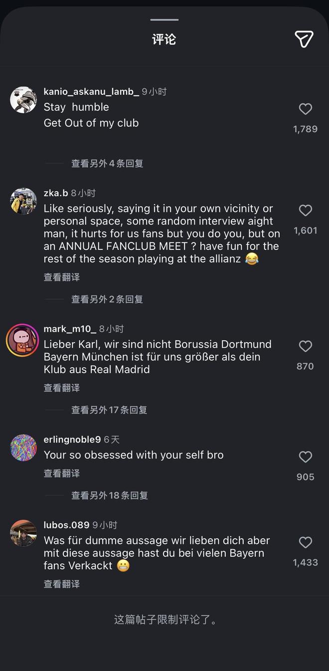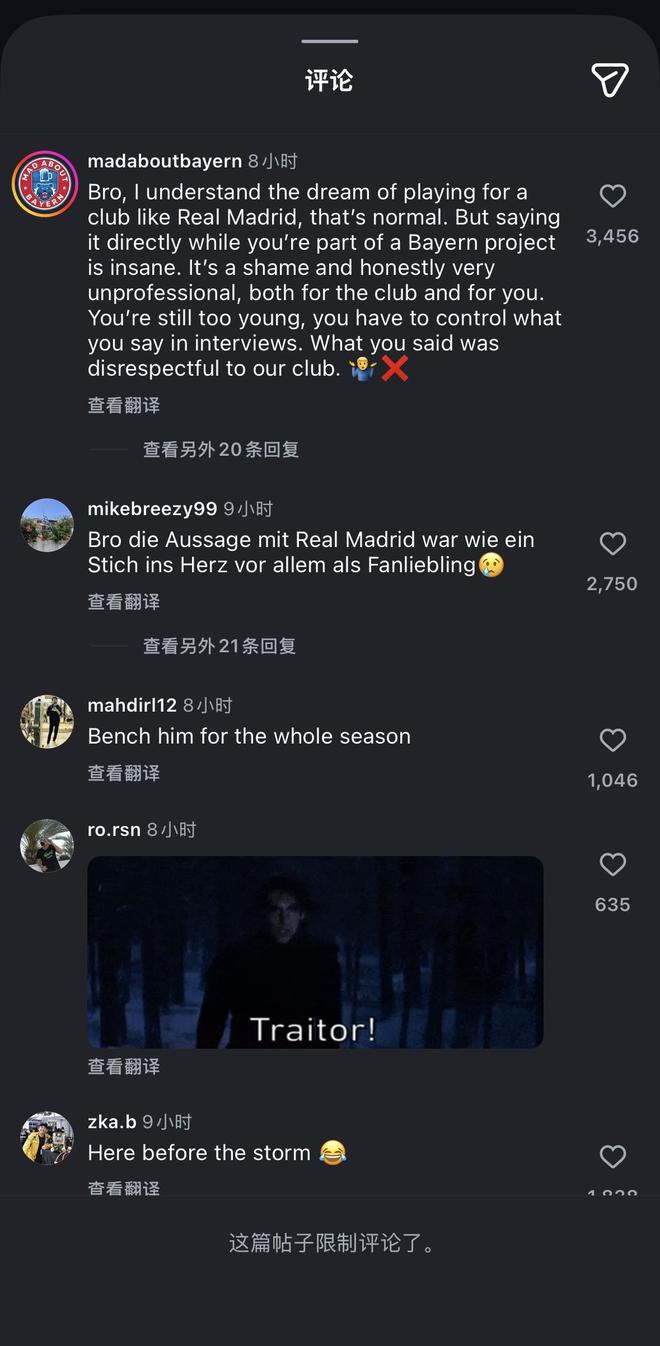 北京時(shí)間1月4日,拜仁舉辦傳統(tǒng)球迷活動(dòng),倫納特-卡爾在接受提問時(shí)表示,自己希望有一天能為皇馬效力。隨后,卡爾的社交媒體賬號被憤怒的拜仁球迷“攻陷”,目前卡爾社媒貼文已被限制評論。