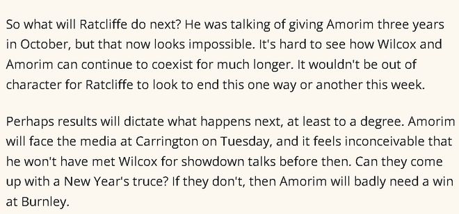 拉爵去年10月還說要給阿莫林三年時間重建,然而,《曼徹斯特晚報》斷言這已不可能,阿莫林和威爾考克斯如果繼續(xù)合作,恐怕也會心存芥蒂。以拉爵的性格,他可能本周就做出改變。