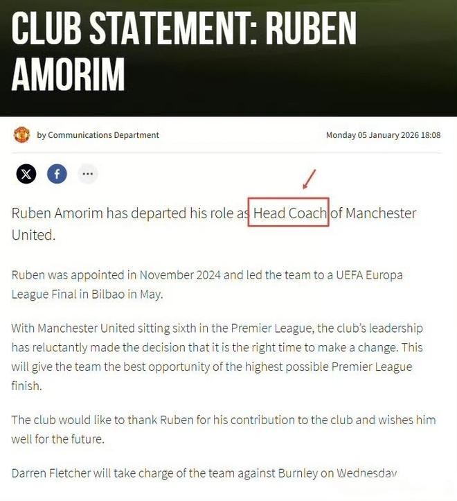 曼聯(lián)管理層在宣布阿莫林下課的公報中寫道:“曼聯(lián)目前在英超聯(lián)賽中排名第6,俱樂部高層經(jīng)過深思熟慮,認(rèn)為現(xiàn)在是做出改變的合適時機?!倍腋邔邮怯昧薱oach而不是manager來描述阿莫林的,這也是讓他很不滿的點??吹某?,高層是對他不認(rèn)可的。