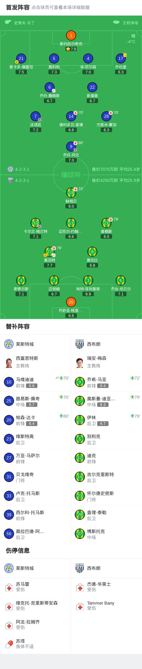 北京時間1月6日英格蘭足球冠軍聯(lián)賽 聯(lián)賽 第26輪,萊斯特城主場對陣西布朗。萊斯特城喬丹-阿尤破門,法塔武破門。西布朗卡爾蘭-格蘭特破門。最終比分萊斯特城 2-1 西布朗。