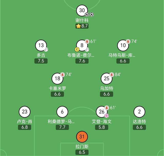 謝什科突前,身后是多古、B費和庫尼亞,卡塞米羅和烏加特搭檔雙后腰。