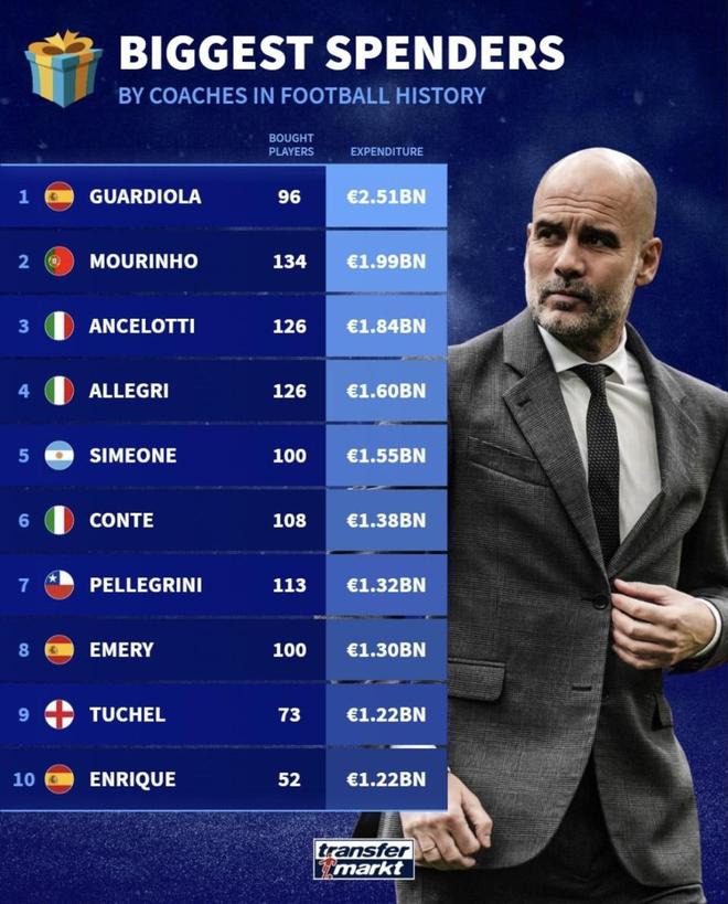 最近德國轉(zhuǎn)會市場發(fā)布了“足球史上引援花錢最多的主教練”榜單,瓜迪奧拉、穆里尼奧、安切洛蒂這些熟面孔都在前排。榜單把“買了多少人、花了多少錢”擺得一清二楚,但另一層問題也跟著出來了:花得最多,就一定把錢都換成了最硬的冠軍嗎?同樣是幾十億歐元級別的投入,有的人冠軍拿到手軟,有的人卻做不到,差距一下就出來了。(數(shù)據(jù)截2025年12月26日)。