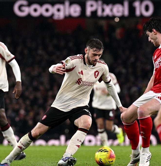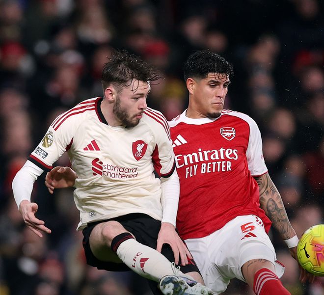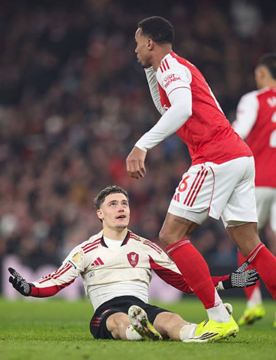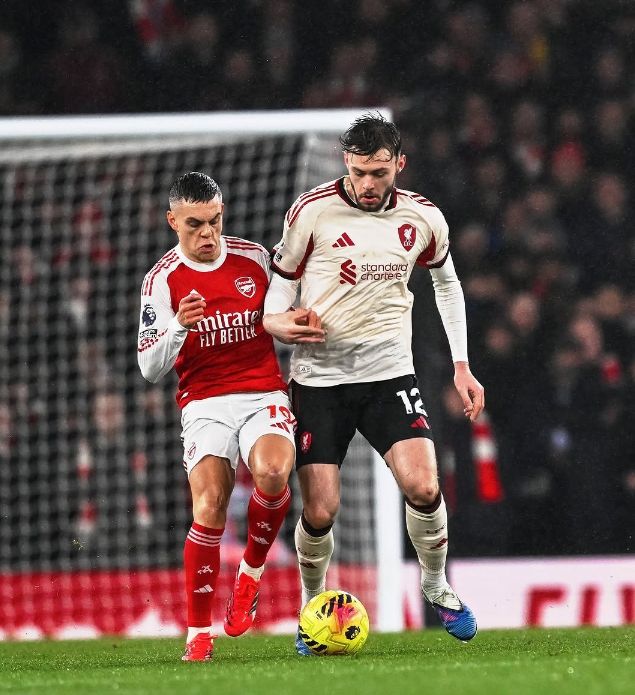 第26分鐘阿森納后防出現(xiàn)巨大失誤,阿利森的傳球直接送到了布拉德利的腳下,后者也是毫不猶豫,直接起腳吊射,可惜運(yùn)氣不佳,皮球擊中橫梁被彈出,斯洛特上任之后,利物浦在聯(lián)賽31次擊中門框,同期英超第一,半場(chǎng)結(jié)束之前,阿森納突然發(fā)力,連續(xù)形成有威脅的進(jìn)攻,但賴斯和薩卡的打門都被利物浦后防化解,兩支球隊(duì)帶著0-0的比分,回到了中場(chǎng)更衣室。