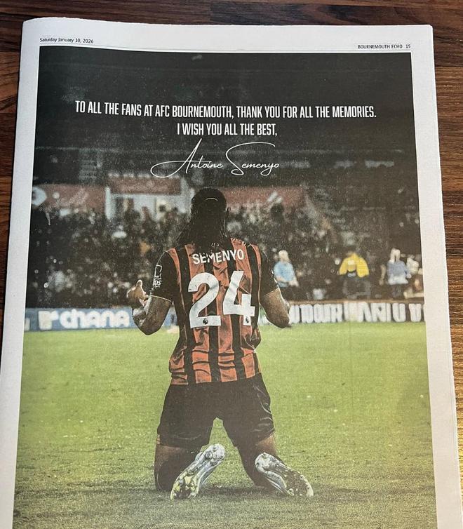 當(dāng)?shù)貢r間1月10日,已經(jīng)轉(zhuǎn)會曼城的塞門約在《伯恩茅斯回聲報》上刊登了一整版廣告,向伯恩茅斯的球迷表示感謝。