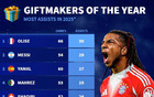 德轉(zhuǎn)列2025年俱樂部+國家隊助攻榜:奧利塞、梅西、亞馬爾前3